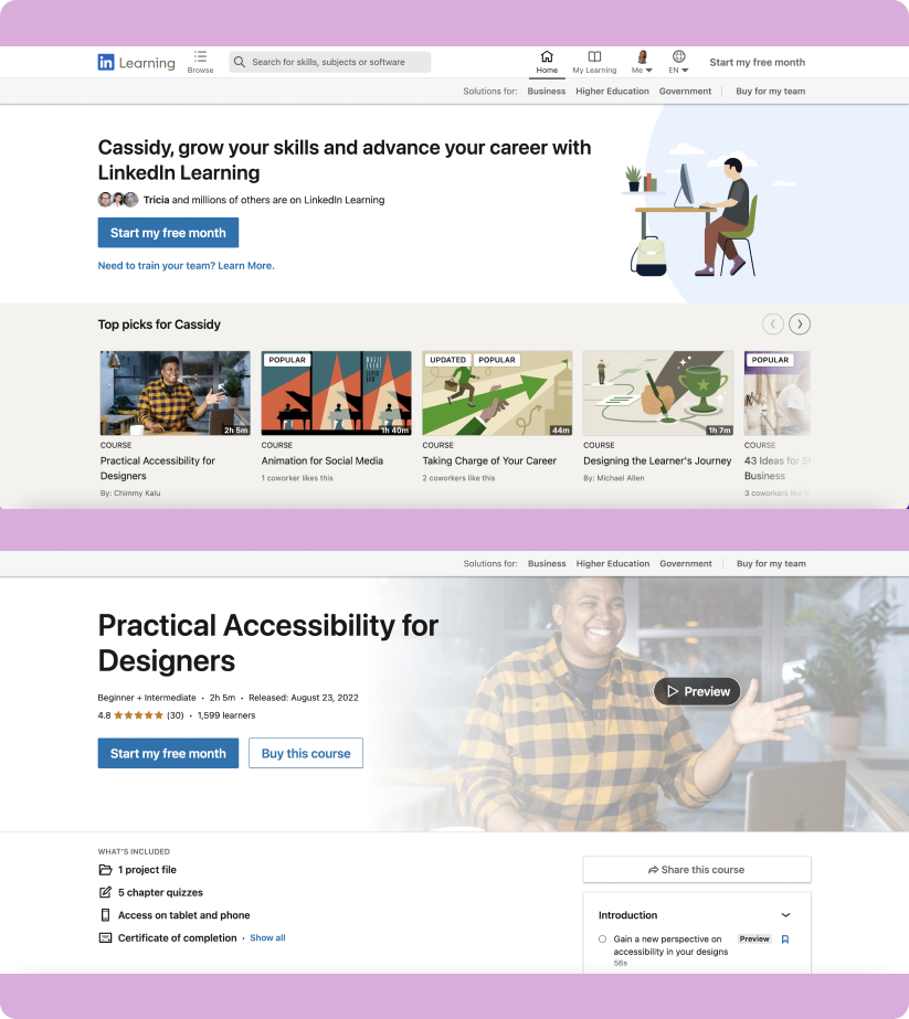 LinkedIn Learning has a customized landing page targeting top picks for the user.